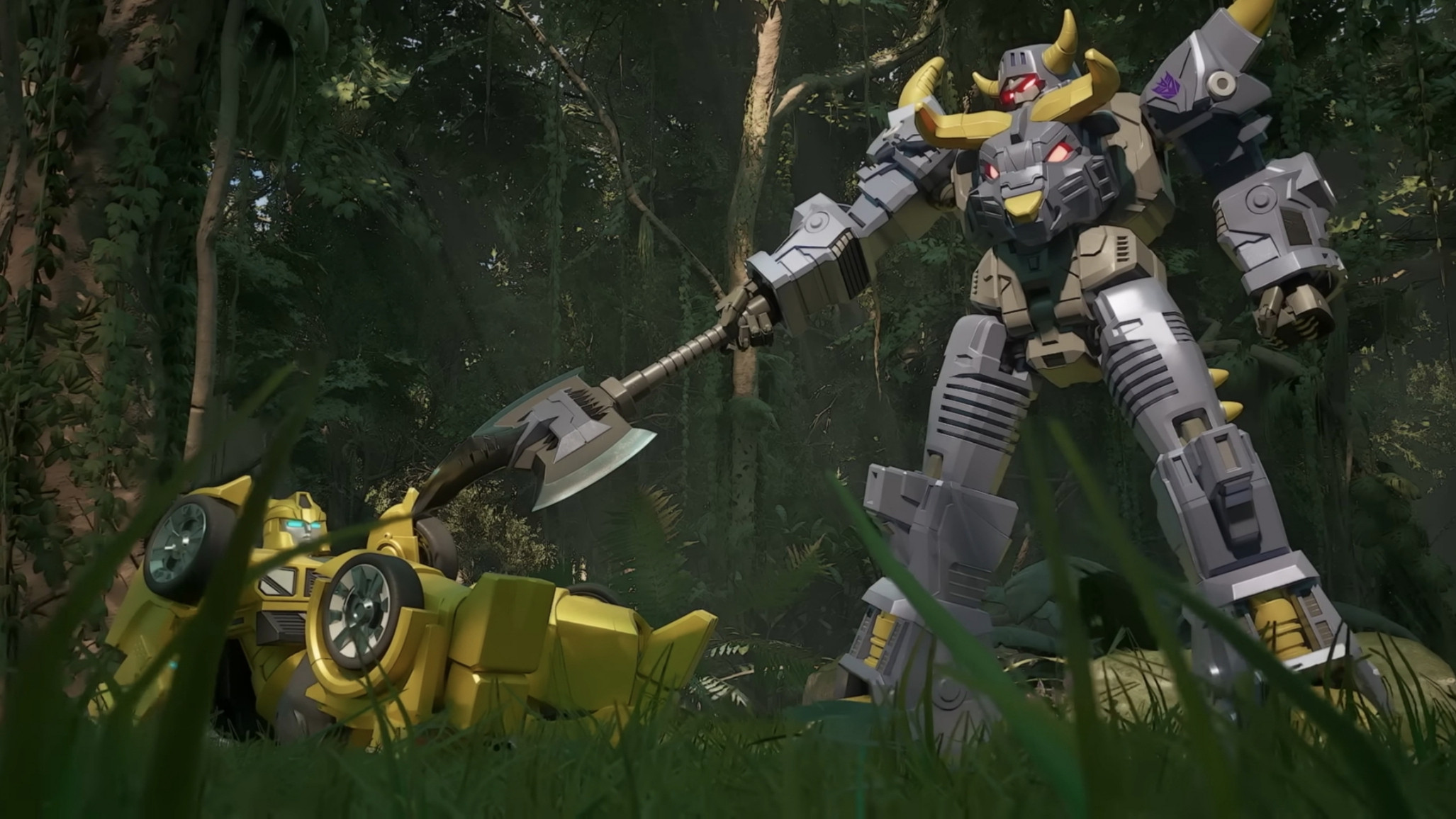 Bumblebee battles Megatron in a target shooting challenge while Optimus Prime races through the jungle, away from Grimlock, to reach his old friend.